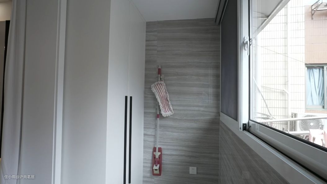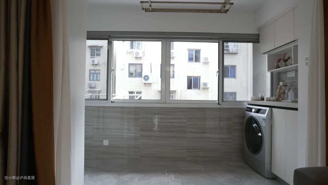 阳台很宽敞,主要承担着盥洗和晾晒的功能,洗手台根据房屋主人的身高量身定制,洗东西的时候完全不用弯腰;角落里还藏了一个储物柜,可以做一些晾晒区的功能收纳~