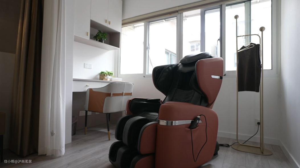 主卧也连接着一个南向阳台,如果说客厅的阳台主要承担生活功能,那主卧的阳台主要就是一个休闲区,小书台、按摩椅...谁不想累了的时候在这里放松一下呢?