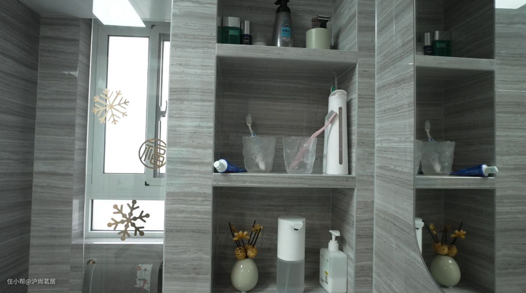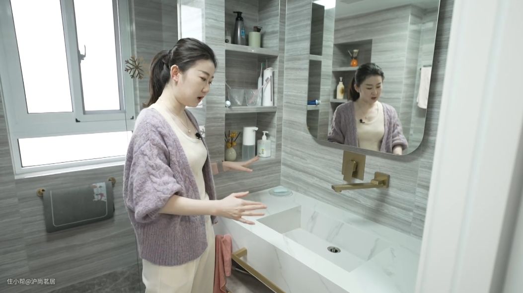洗手台的设计,整体性非常好,高级感十足,日常打理起来也非常方便~下方储物柜采用中空设计,放东西、拿取都很方便,日常打扫的时候也没有清洁死角;