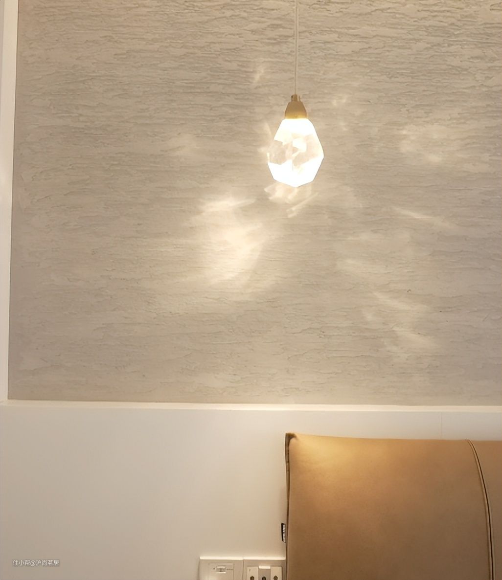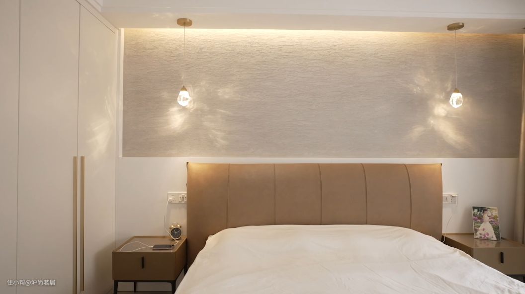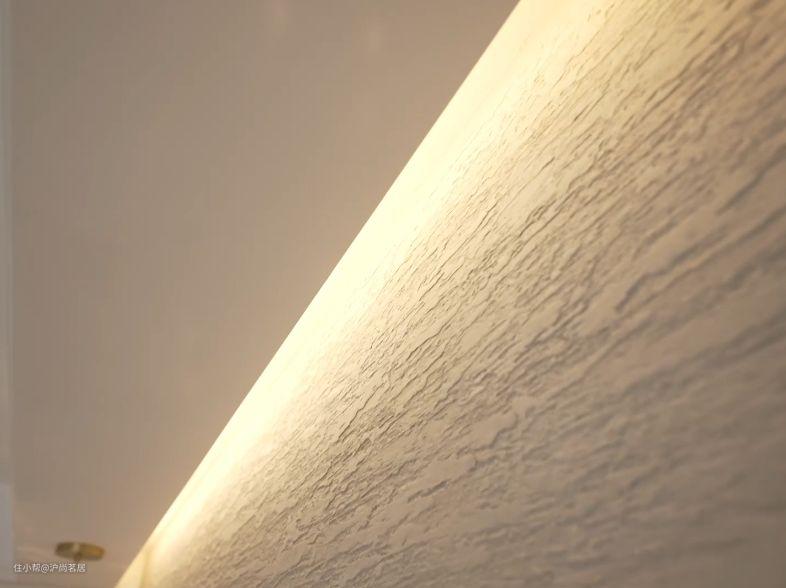 床头使用硅藻泥做了艺术墙,上方装了一整排内嵌式的洗墙灯,灯光打下来的时候,充满高级感的纹理就凸显出来了~