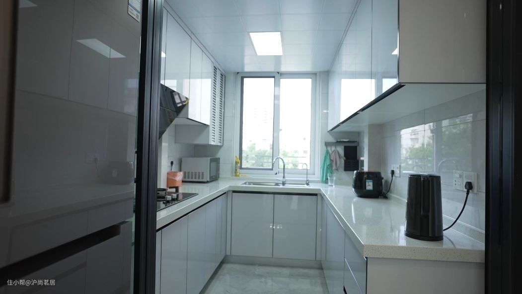 厨房做了三联动的玻璃移门,让门洞的空间尽可能的敞开化,进出的时候完全畅通无阻;厨房采用U型设计,空间利用率很高,备餐台储物空间、灶台和洗碗池全部各司其职,井井有条!
