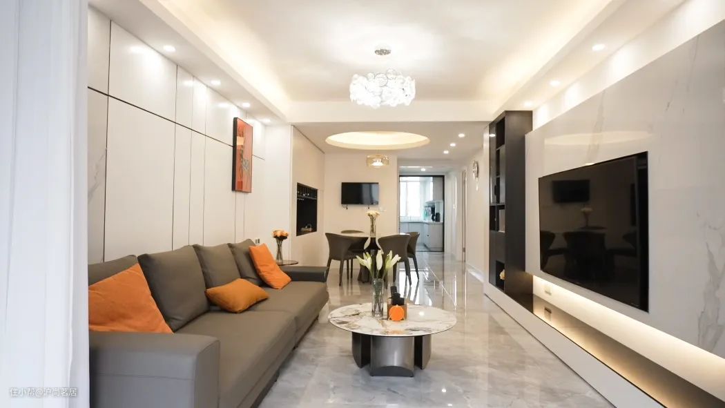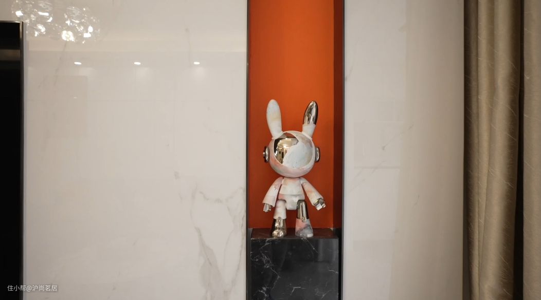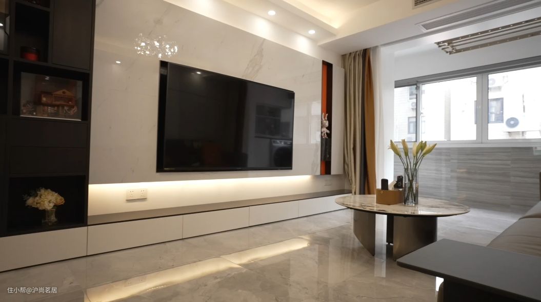 电视背景墙一侧做了一些小的陈列和展示的柜门,让整个电视背景墙看起来更加丰富;做了一整面墙的大理石纹的岩板,以白色为主,加一些灰色的点缀,另外一侧是一个小小的壁龛,既可以装得下可爱的日常,生活中也有非常实用的功能。