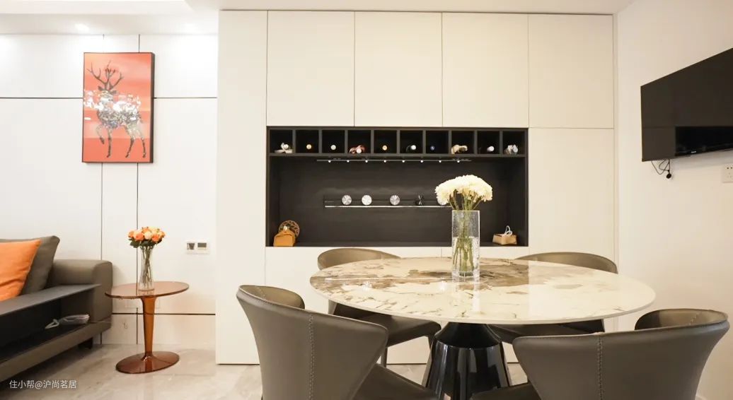 餐厅的旁边做了一整排的餐边柜,白色干干净净,和整个墙面连成一体。这种大量完整面的设计,在拥有储物空间的同时,也丝毫不会感觉到空间里面的繁重和多余~