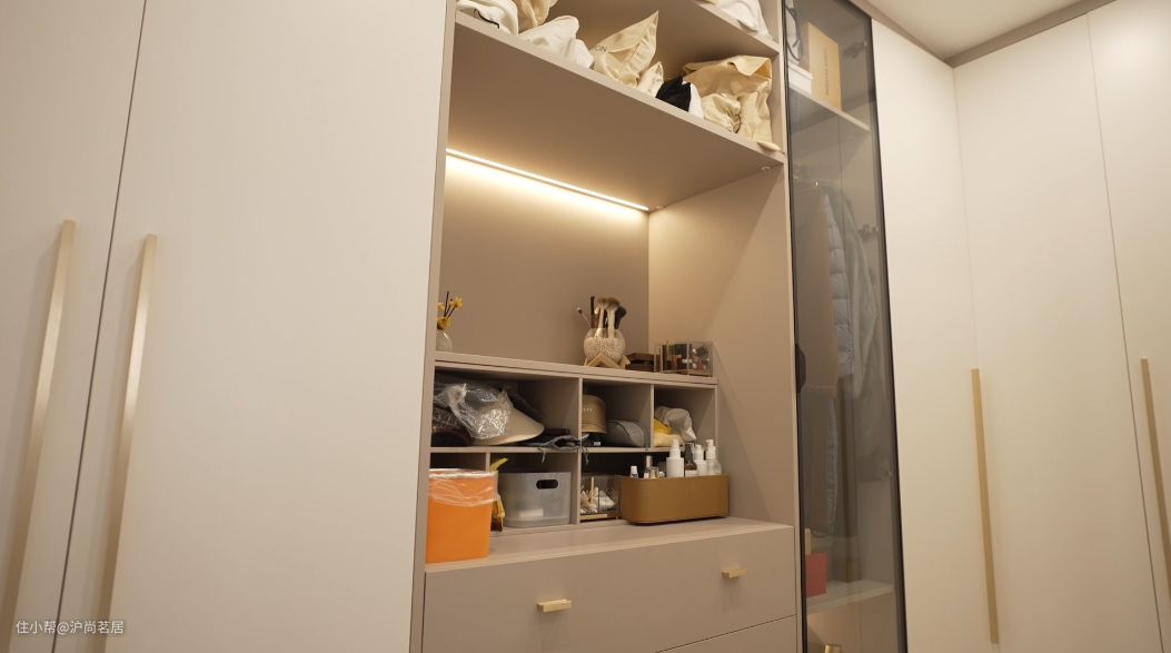 主卧为套房设计,衣帽间由原来客厅空间的一小部分挪过来的,包柜、衣柜设计齐备,特别符合日常生活的所需~