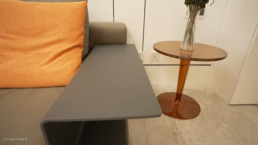 简约舒适的沙发搭配小巧精致的茶几,沙发一端的扶手,设计了一个小边几,平时可以放置饮料和水果,偷懒星人狂喜!