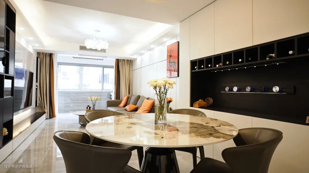 餐厅上方做了一个圆形的吊灯,正好呼应圆形的大理石餐桌,既有视觉上的不同功能区域的风格感,又让整个空间看起来非常宽敞。