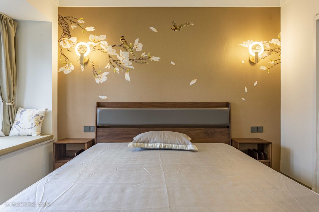 主卧的设计上以暖色为主,墙面的两盏圆灯保证空间的照明,墙体则选用了米棕的墙布作为饰面,加上花鸟的图案更有禅意。搭配木质床头,整体给人舒适温馨的感觉。