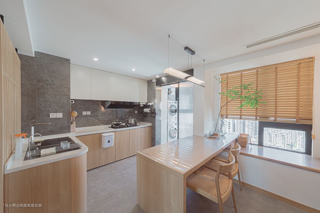 餐厅很具有代表性的就是岛台式的餐桌,以及木格栅做的餐边柜,跟客厅也做到了呼应,颜值高又实用。