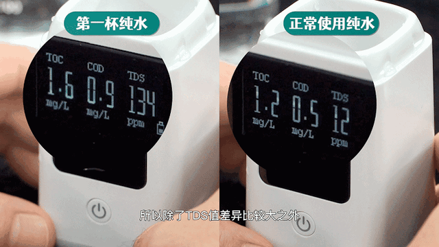 用两个杯子,分别取清晨第一杯RO水和正常的RO水,倒入水侦探进行测试,第一杯水的TDS值为134mg/L,正常RO水的TDS值为12mg/L。可以看到,两杯水除了TDS值的差异比较大外,TOC等其他值没有明显差异,且都是低于5mg/L的国家标准。
