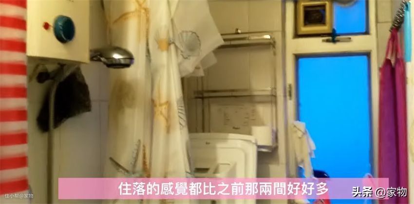然后是卫生间,尽管没有干湿分离,但是空间不局促,还有了洗衣机和晾晒区,满足日常生活所需,比第一套劏房好太多了!