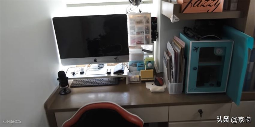 客厅后方是主卧,只有衣柜+双人床,满足储物和日常休憩的需求。旁边的房间是工作室兼书房,不大但够用。