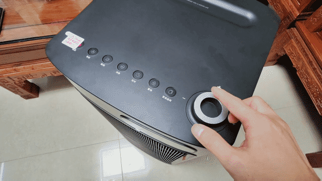 机身顶部也布置了物理操控区,风速档位采用的是空心圆形旋钮,具备5档风速,内部的一圈环形灯带会随着当下空气质量切换不同的颜色。显示屏很宽副,具备功能显示以及空气质量的实时监测同步显示。