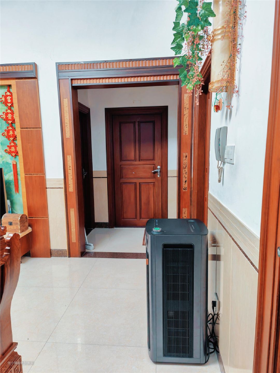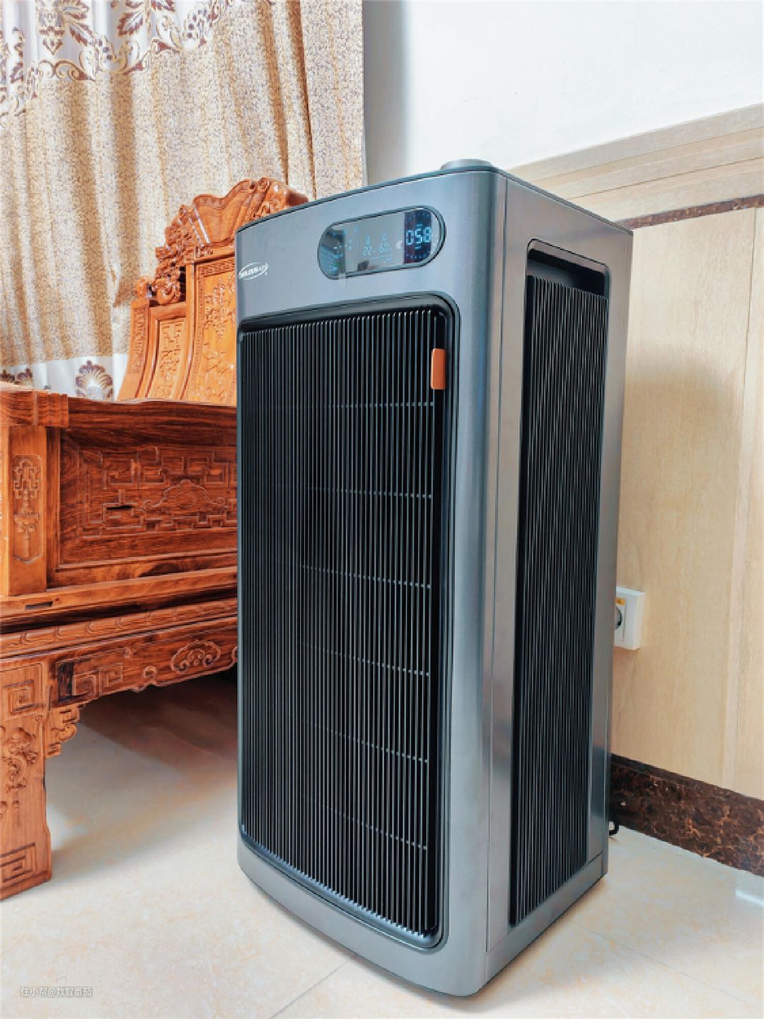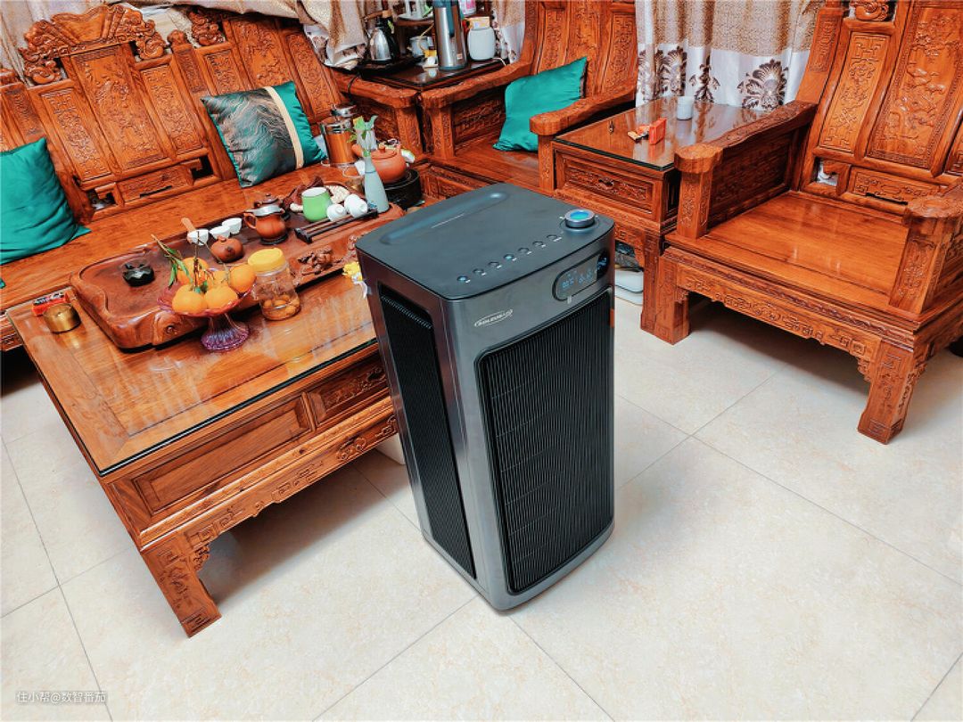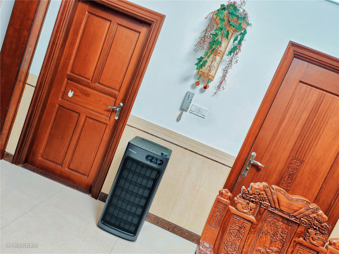 刚开始我是摆放在客厅的左侧,发现全屋风循环净化有点慢,才发现我摆的位置不对,后面调整到与房间直通的另一边(图中位置),左右出风,循环加快。