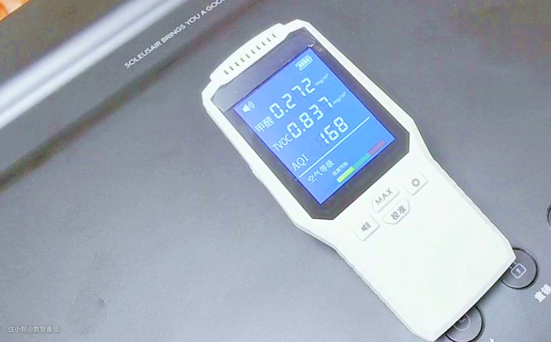 客厅:甲醛0.27-TVOC 0.8-AQI 168,轻中度污染