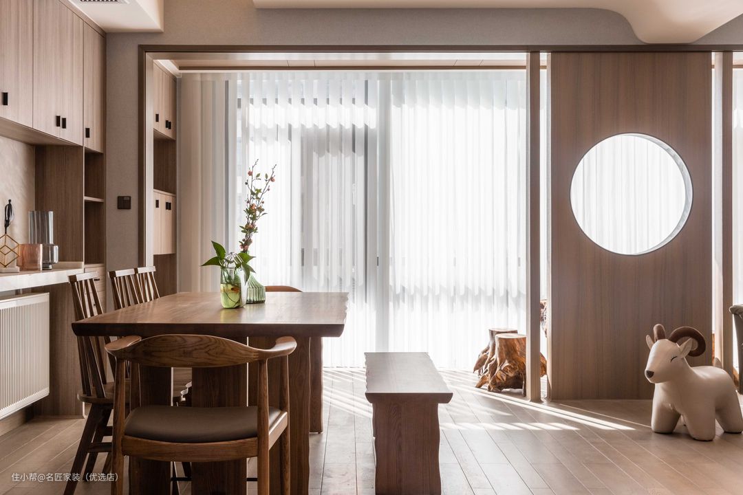 整体采用原木地板通铺,三个区域相互贯通。休闲区域并入客厅,做出隔而不断的空间划分效果。原木座椅采用有厚度的木制材料,中式长椅给人厚重的人文历史感。格窗透进的阳光搭配室内设计,生出自然恬静的生活气息。
