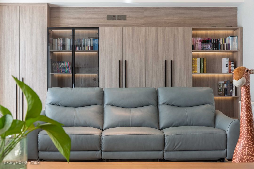 借助蓝色皮质沙发在感官、精神内涵层面引发美的通感。空间中,长颈鹿摆件也成了空间装置的一部分,为整体添加些许童趣。定做的木制书柜代替了背景墙,木制书架的古朴自然为空间带来宁静。