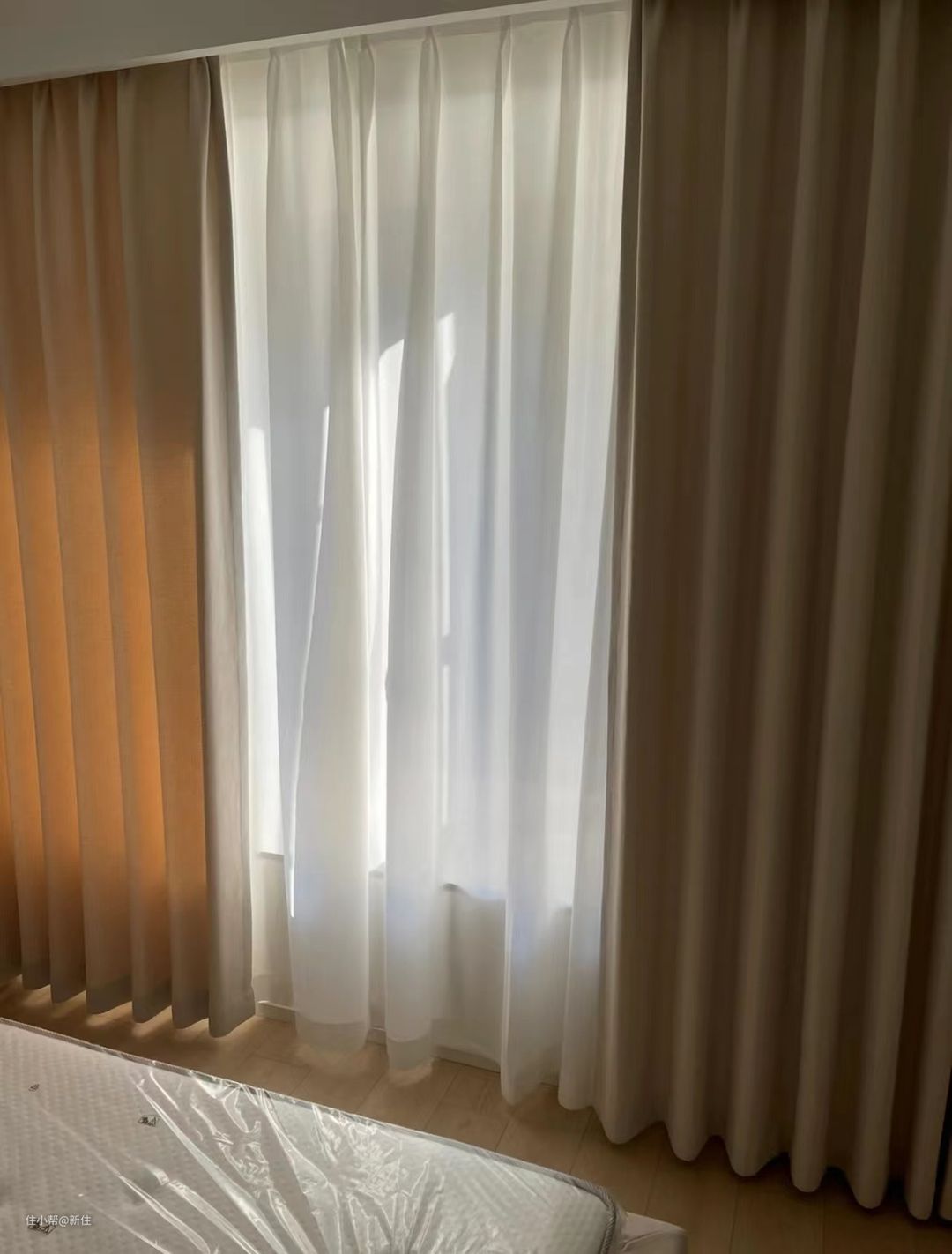 新住小tips:绒布材质虽然垂感好,但藏灰的缺点对鼻炎患者和灰尘敏感者都不友好,家用窗帘更建议选择高精密材质的,密度高,遮光能力更好,且表面光滑,不易藏灰。