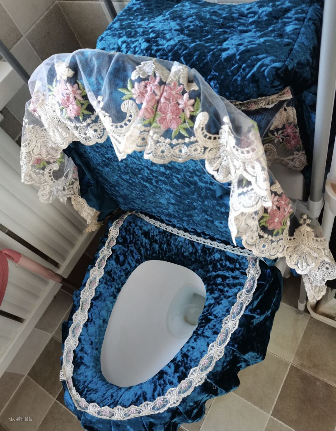当然,图片上的是比较典型的,普通人不会极端到在座圈、马桶盖、甚至水箱上都加盖布。