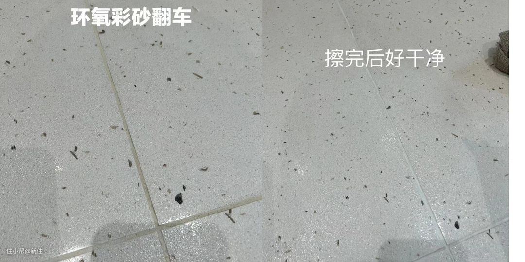 新住小tips:已经做了环氧彩砂美缝的,也不要因为它的吸色变色而心累,可以尝试一下渗色清洁液,我也是在偶然间发现它清洁环氧彩砂好用的。