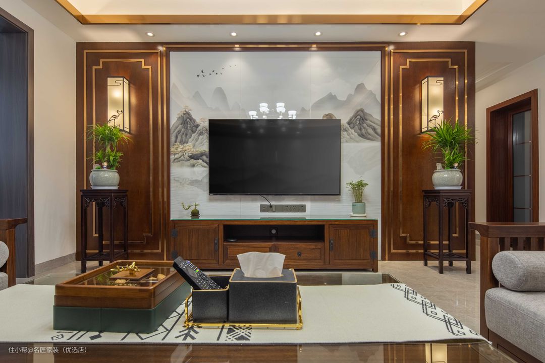 电视背景墙将东方独有的内蕴与大气,以山水墨画、对称笔法、高脚实木花几等具象的形式在人们眼前展现。从线条到材质,从色彩到空间布局,用现代设计手法的灵活运用将传统装饰符号重新铺排,让其体现东方现代文化底蕴,也更贴近当代东方人的审美情趣。