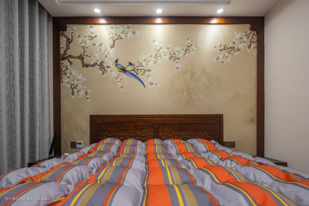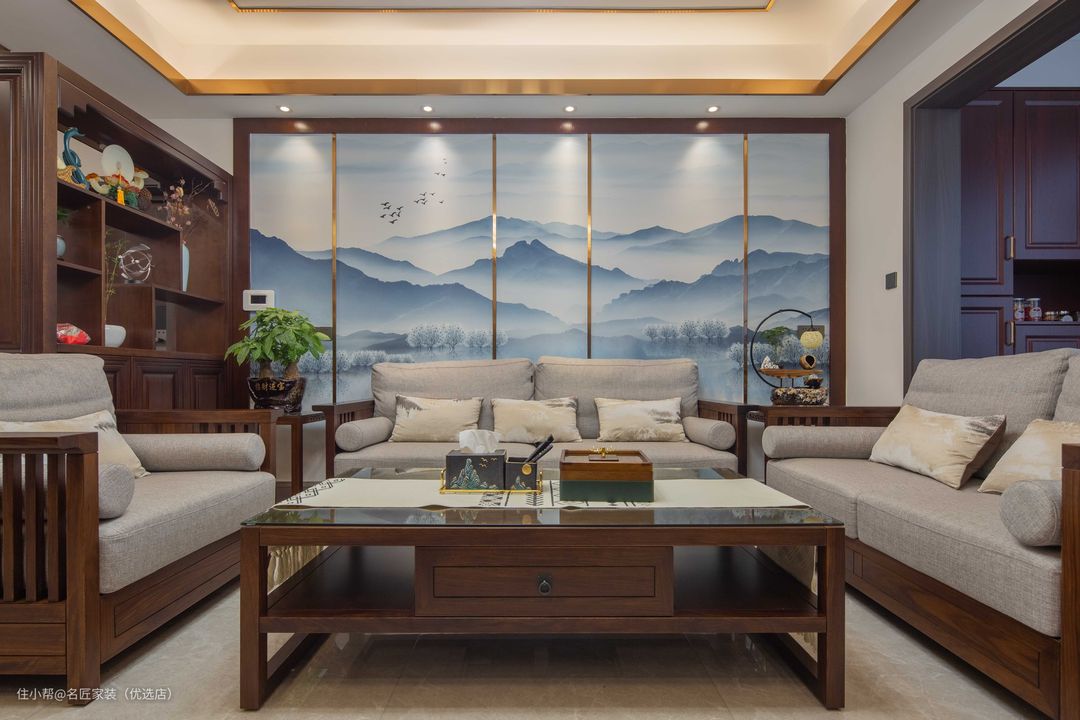 电视背景墙将东方独有的内蕴与大气,以山水墨画、对称笔法、高脚实木花几等具象的形式在人们眼前展现。从线条到材质,从色彩到空间布局,用现代设计手法的灵活运用将传统装饰符号重新铺排,让其体现东方现代文化底蕴,也更贴近当代东方人的审美情趣。