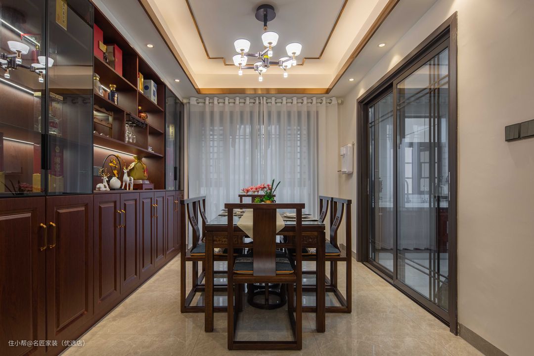 餐厅整个空间简洁大气,搭配设计感十足的吊灯,显得自然、轻松,不落俗套...餐区的设计亦以典雅为意,贴近自然的木色与纹理、木质的餐边柜、古雅的吊顶设计与清雅的陶瓷杯樽等器物陈设,娓娓地述说着东方的故事。