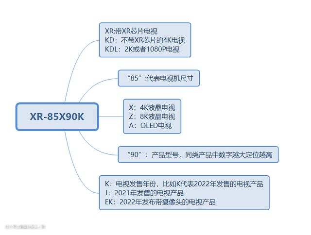 "XR":XR表示表示该型号带XR画质芯片,2021年开始中高端型号开始标配。定位稍低或者之前未采用XR芯片的电视前缀为KD或者KDL,其中KD表示4K分辨率电视,KDL表示1080P或者2K分辨率电视。