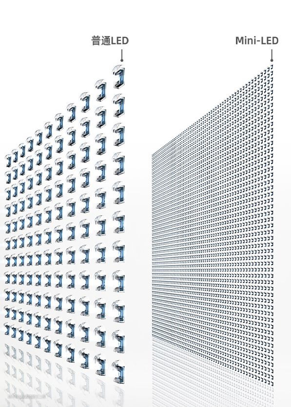 Mini LED作为发展Micro LED的过渡技术,目前已经相对成熟,相比传统LED电视来说优势还是很明显,和OLED相比也各有优势。技术上与目前小间距LED显示技术相似,但显示功能上实现了小间距LED功能拓展,控光效果更好(当然功耗也上去了,对硬件堆料和软件条件的要求也更高)。同时成本上来说也比OLED低很多,简单来说,Mini LED电视是画质介于普通电视和OLED电视中间,目前来说是个不错的选择。一年多时间,Mini LED迅猛的销售势头已经影响到OLED产品线,未来一年OLED和Mini LED的竞争应该会更加激烈。