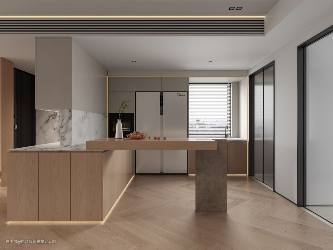 完美的厨房的灯光,首先环境光一定要有顶面的光源,虽然无法解决切菜炒菜的问题,但也一定要有,吊柜下的那一排灯带非常的重要,一定要贯穿整个的台面,这样切菜洗菜的时候才会有灯光,不会背光。操作台的灯光色温要选择冷光,冷光更容易让人精神集中,不容易切到手。