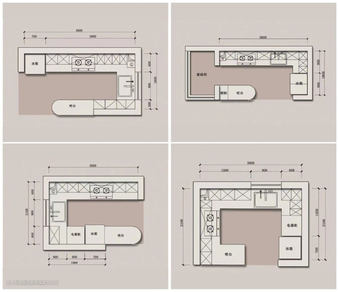 很多业主问完美厨房的布局是二字型、L型还是U型?其实都不是,在不考虑空间限制的情况下,“U+1”也就是U型布局加上一字型的岛台,是最完美的厨房布局。当然“U+1”有很多的变种,例如说“L+1”或者是J型也都还不错。其次,带一个阳台的二字形的布局,由于可以分别设置灶台、操作台和水盆柜的高度,基本是小户型最优的布局。