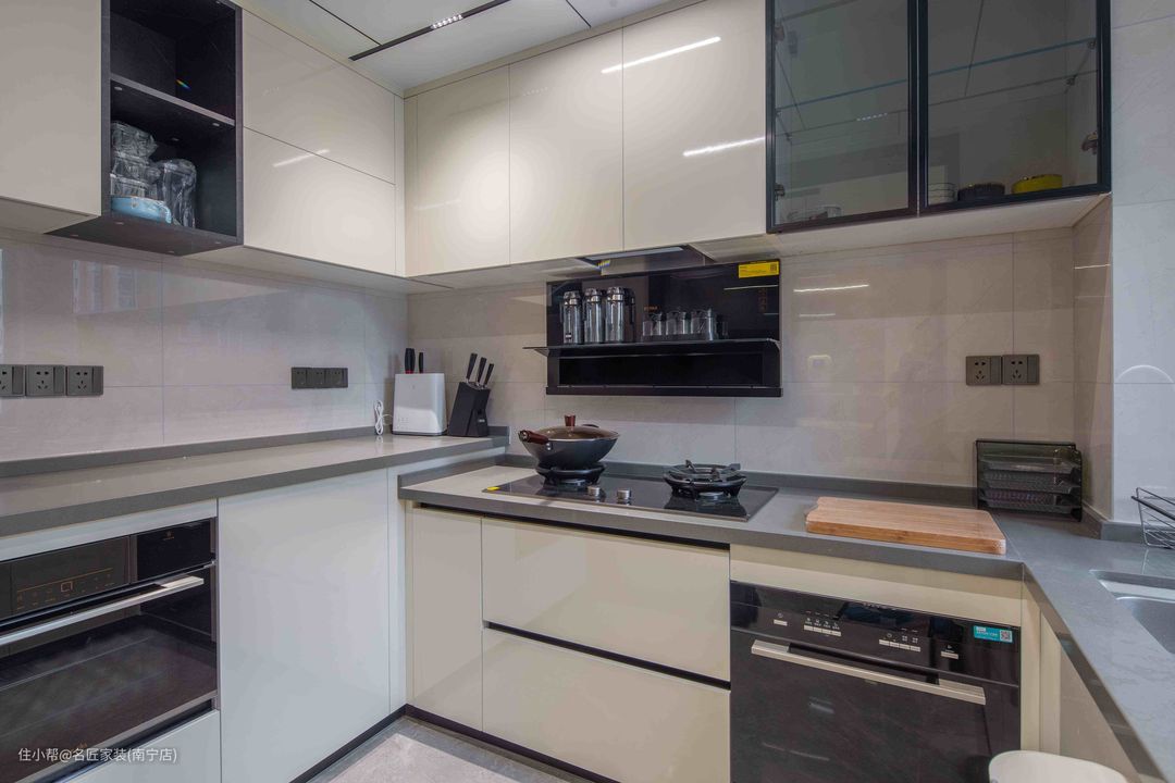 厨房选材以方便清洁为主要考虑,回形台面使用起来更加流畅。灰色台面耐脏耐磨,配合白色柜体简约又不失功能性,亮面的材质选择比起哑光更适合厨房,搞起卫生来也更加方便。