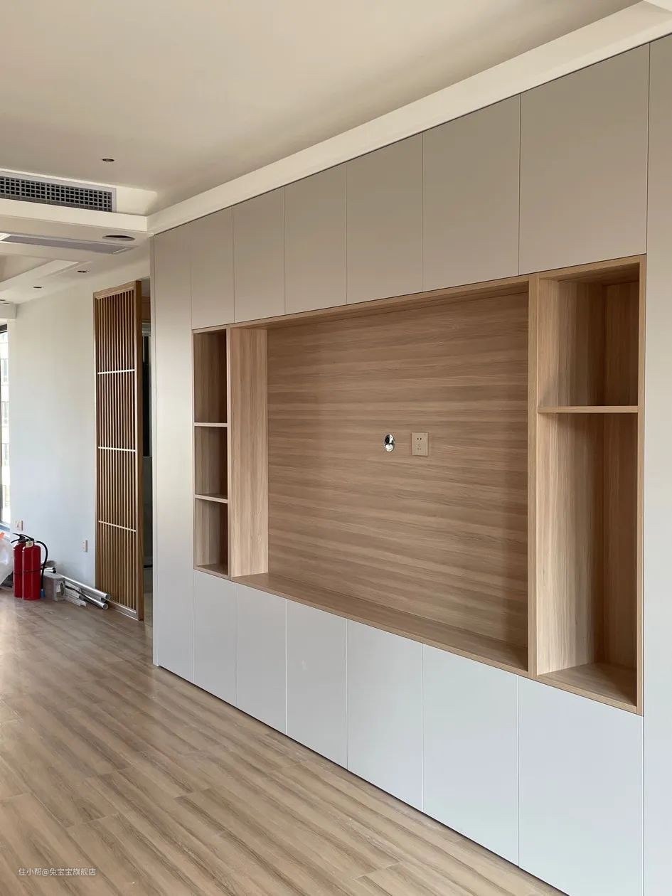 白色电视背景墙简约干净,搭配深灰柜体板,告别单色带来视觉疲劳。