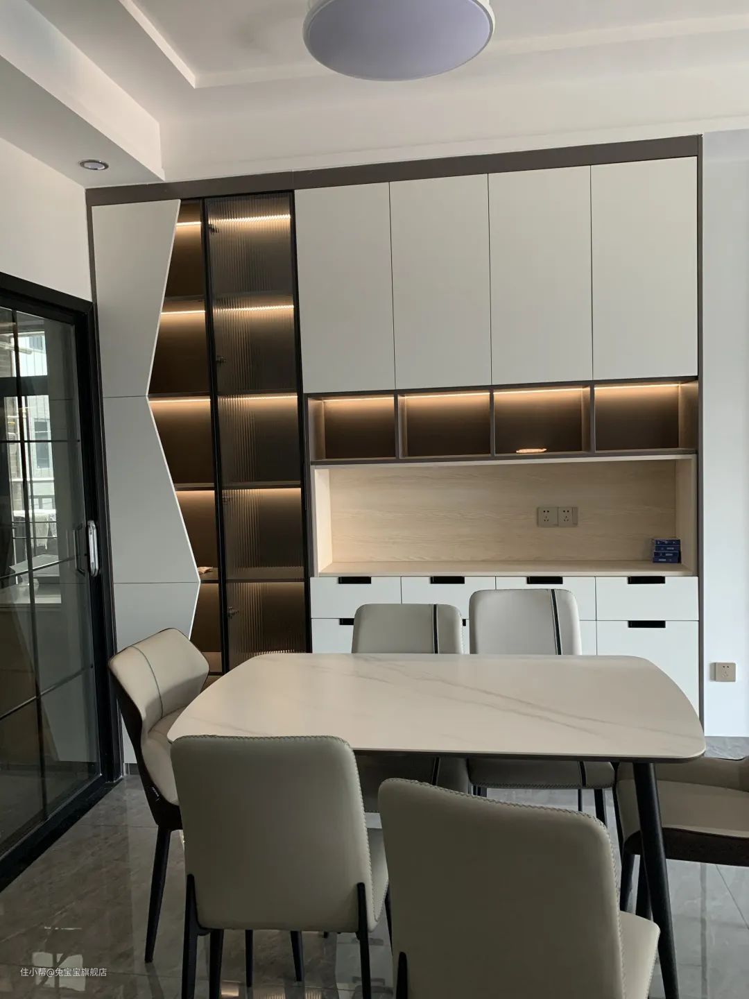 整体以白色为主,给人出尘脱俗之感!暖白色柜门,半墙隔断与长虹白玻,进门就让人眼前一亮。