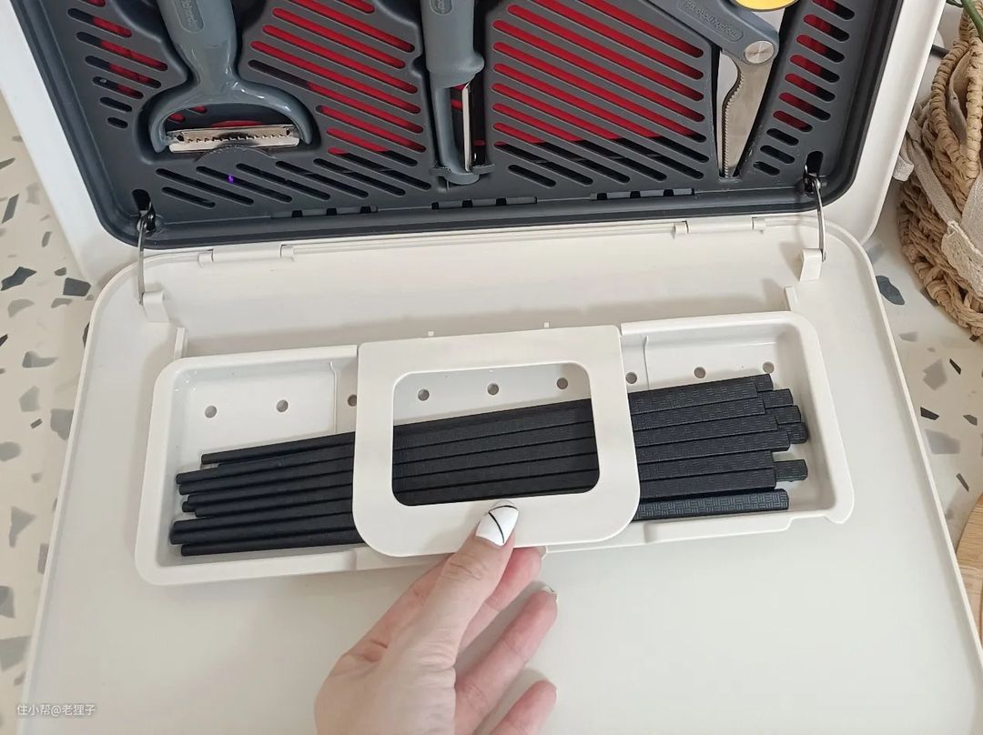 这款消毒刀架是隐藏式收纳设计,无论是筷子还是刀、砧板都可以直接收纳在刀架内部,所以不会有落灰的烦恼~