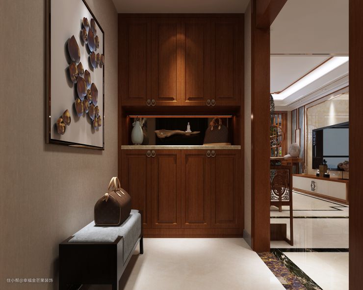 入户玄关设计木质玄关柜,一进门即可感受到中式风韵的韵味,让人更加想要快步走入屋中,感受其中式魅力。中式的设计,也为玄关进门之间,增加了尊贵的仪式感,回家也更加有了分量。