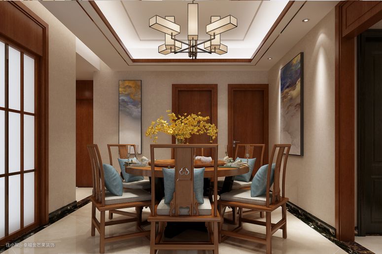 古色古香的中式氛围餐厅,大圆桌有团团圆圆、和和美美之美好寓意。实木餐桌、餐椅温润治愈,令人更加舒适放松。一株中式的插花,搭配互相呼应的画饰整个餐厅就变得更加活色生香了起来。
