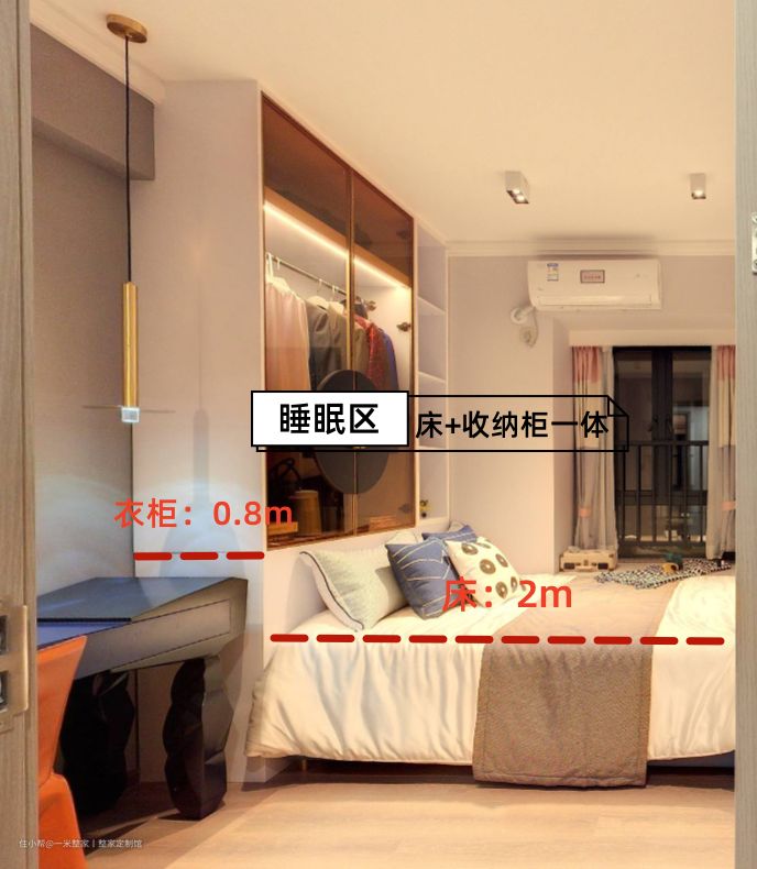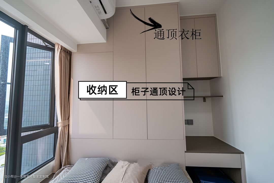 把衣柜布置在床头的同时,要给衣柜做【通顶设计】。即使不能利用好底部的收纳空间,也要利用完上方的空间。
