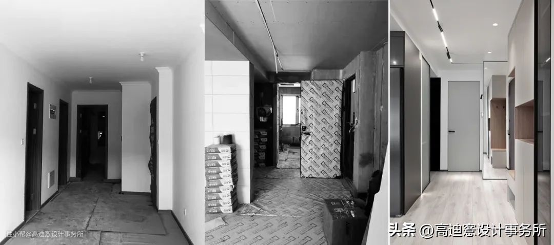 户型缺陷:原来入户正对墙面因为门洞的切割视觉上非常零碎,且过道空间前后墙面不平整,整体看上去凌乱局促。