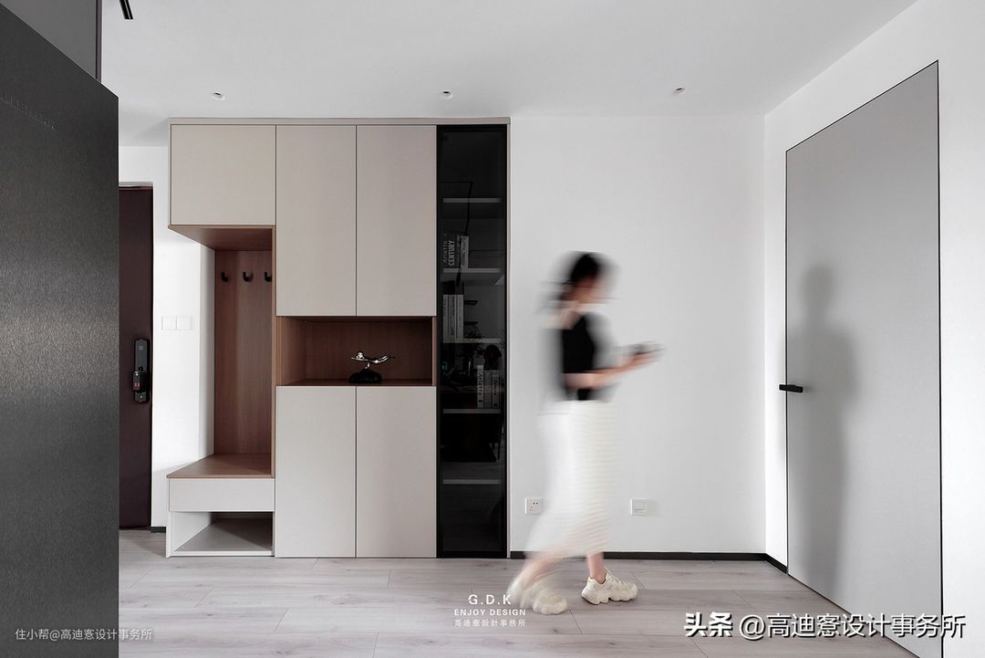 · 入户左手边规划了鞋柜和简单的储物,正前方则设计了大容量的储物柜。
