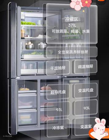 上方冷藏室,空间非常大,足足有371L的容量,平时家里多余的水果,蔬菜,鸡蛋都可以放在这里进行保鲜冷藏,过段时间拿出来依然非常新鲜!如果需要特定保鲜的果蔬,可以直接放在全宽果蔬养鲜抽屉,专属保湿区,可以保留果蔬中充足的水分,保证食用时的鲜嫩口感,加宽设计,像大件或者比较长的芹菜等食材也可以直接放入,方便又省心。