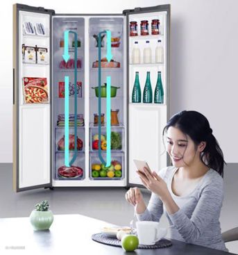 平时我们使用冰箱的时候总会遇到结霜且难清洁问题。这款冰箱采用的是全风冷制冷,自动智能除霜,解决了用户使用冰箱时易结霜的难题。而且风道结构设计的非常科学,360°环绕出风,保持食材新鲜。