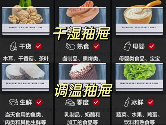 下方设置干湿抽屉和调温抽屉,食材分开存放,更科学,更营养。