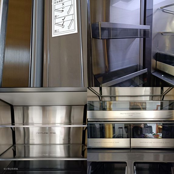 这款冰箱的材质用料非常高档,而且细节方面处理的十分精巧。 门封采用的是PVC材质,具有抗菌、除霉等功能,材质非常安全;深色半透悬臂门搁架,足足有3mm厚度,搭配金属卡条,更加结实耐用;层架设计也很人性化,可以根据需求调整悬挂位置,自由调整存储空间,金属卡条搭配玻璃材质,承重能力更强。冰箱的内胆及门胆采用的是不锈钢材质,奢华高级,耐用且承重能力大,不易腐蚀、变形,易清洁,能有效防止细菌等微生物的滋生;果蔬抽屉、多功能抽屉使用的是铝合金拉丝拉手,设计高雅,拉动手感丝滑,非常顺畅。