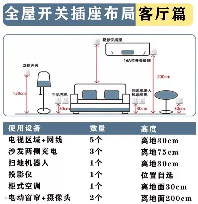 注意事项:1:进门最好有一个客厅的双控,方便夜间进出。2:餐桌上方注意预留插座,方便充电和用餐时需要用到的电器。
