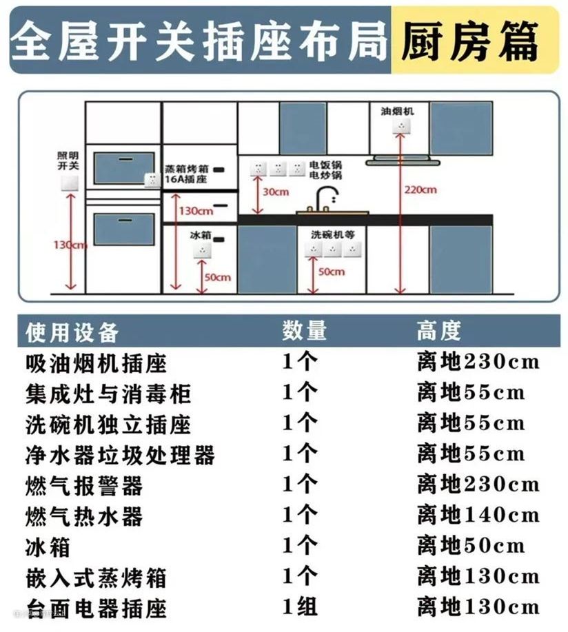 注意事项:1:厨房最好先考虑好所需要的设备,根据所选设备和橱柜在确定具体插座点位。(这样更为准确)2:水槽下方没考虑好是否需要末端净水、垃圾处理器、洗碗机,留一个也可以,后期需要这些设备,一个转接头搞定还省钱。