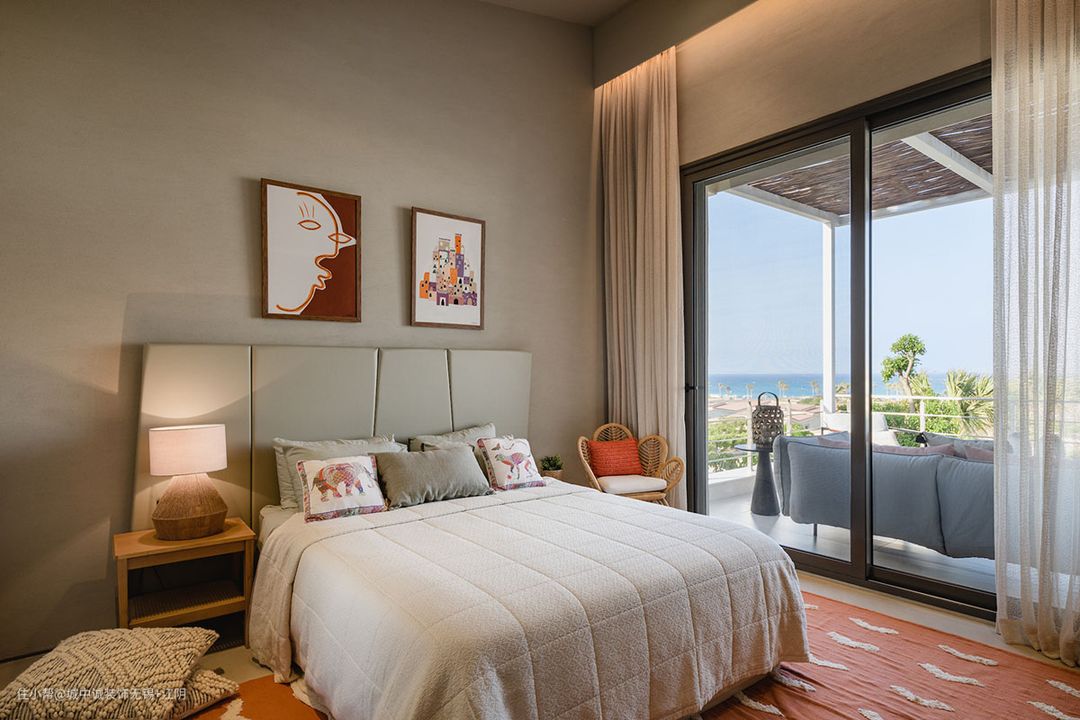 楼上的卧室设有私人阳台。软垫床头板与色彩相配的墙壁融为一体,营造出宁静的装饰方案。卧室区域地毯、墙壁艺术和柔和的橙色装饰品提供了短暂的温暖对比。