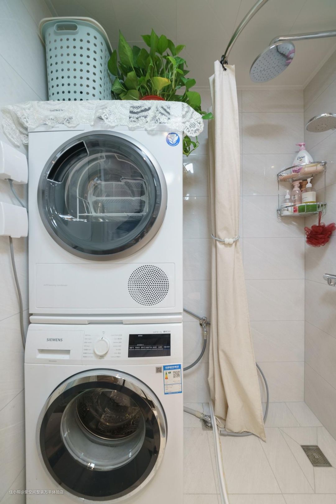 浴帘相比玻璃淋浴房打理起来更方便,每隔一个季度拿下来直接塞进洗衣机里,方便又耐看!