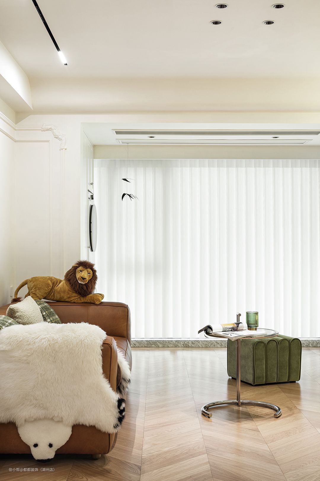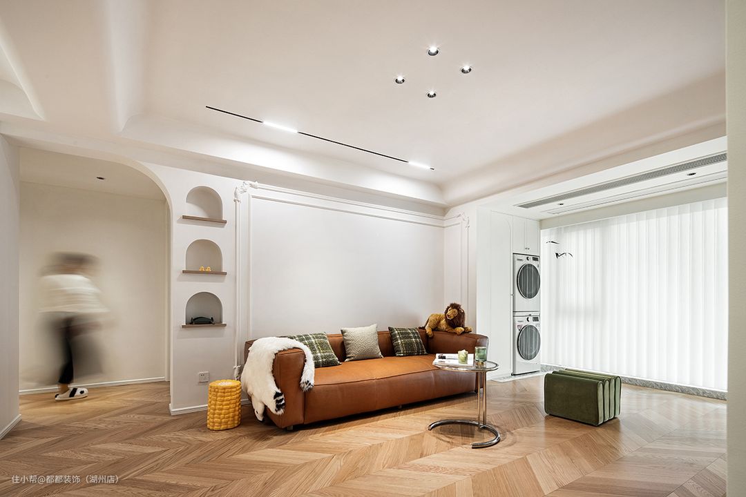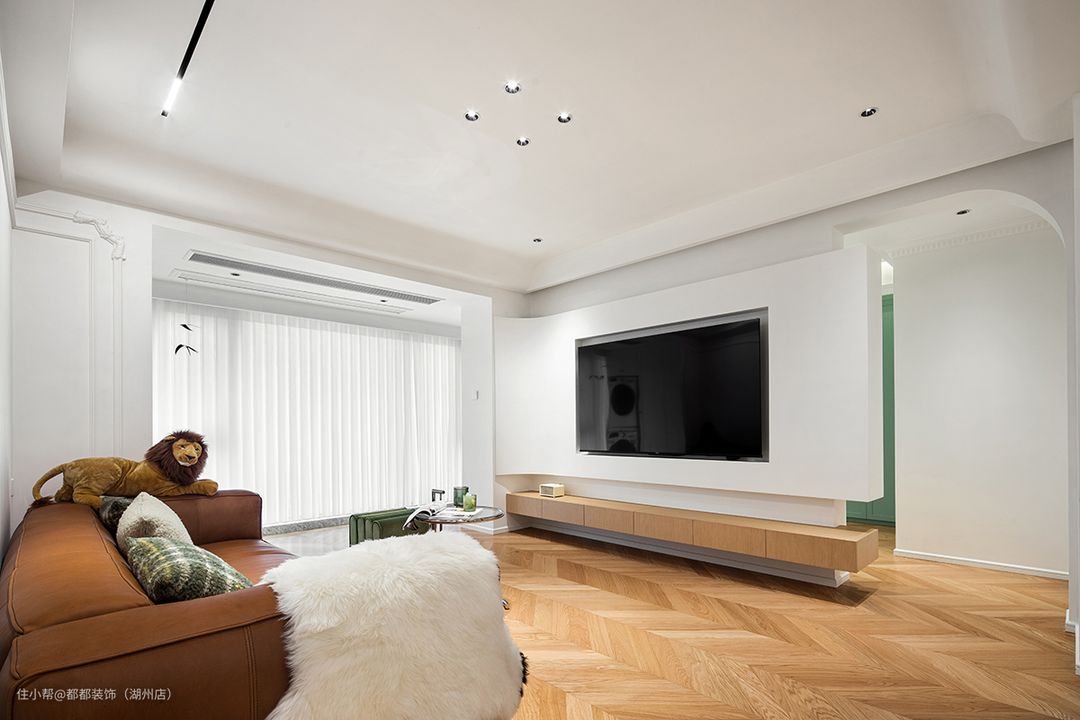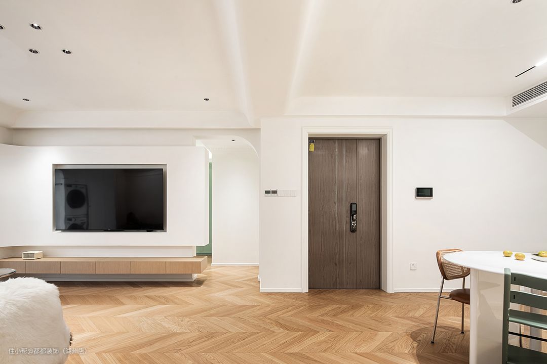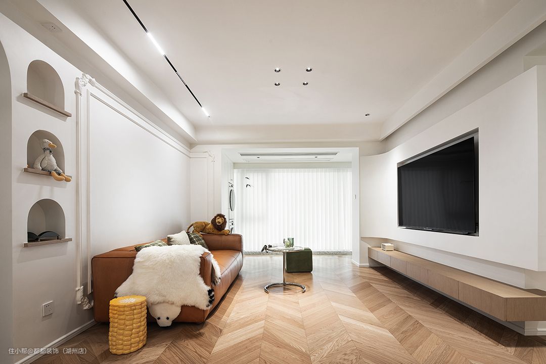 步入客厅,纯粹的奶油白与胡桃木人字拼作为空间基色,勾勒出自带优雅复古氛围的居所,背景采用了大面积的留白手法,配以极简石膏线条+立体雕花为装饰,在线性射灯的照射下,显得空灵而开阔