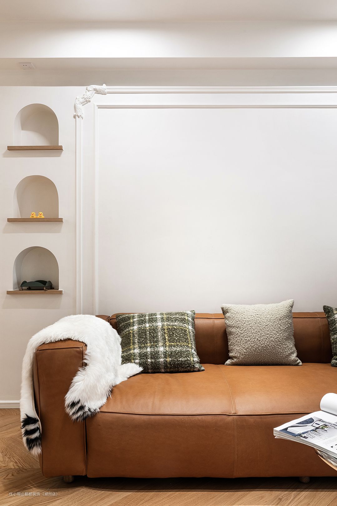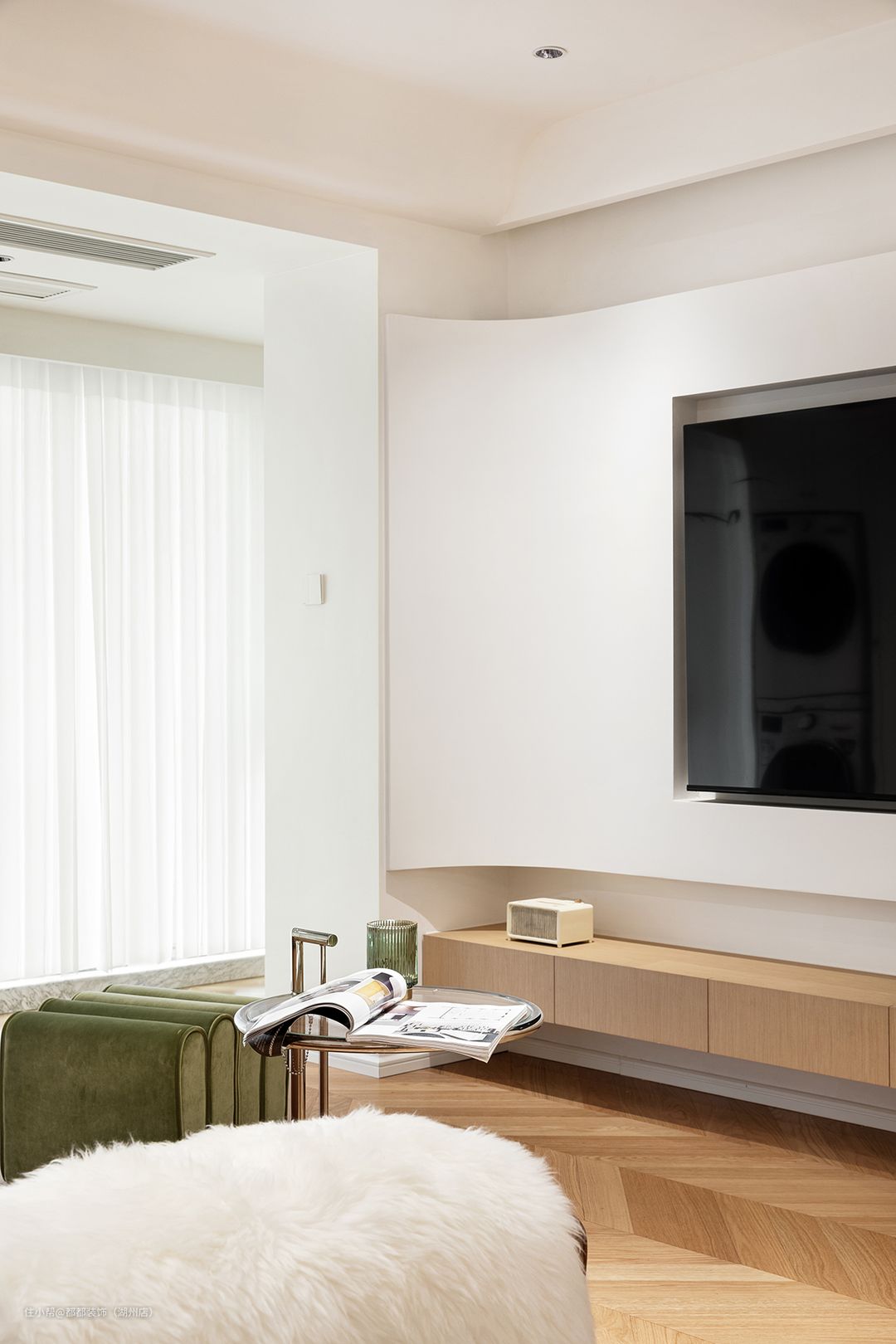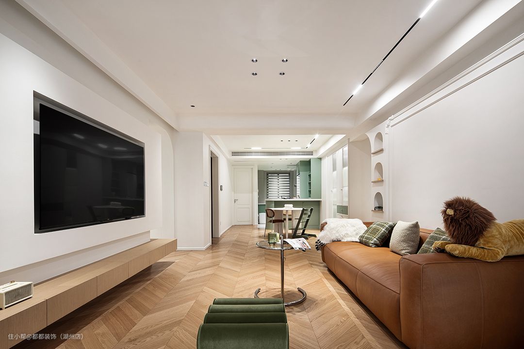 三个拱形壁龛曲线圆润流畅,沉淀出客厅治愈内敛的格调,穿插的绿色编织抱枕为客厅软装注入灵魂,空间律动着鲜活的生机和无限的色彩张力