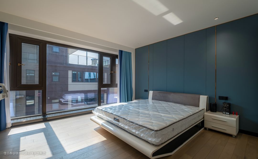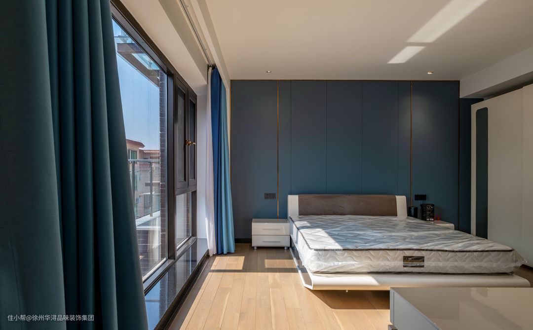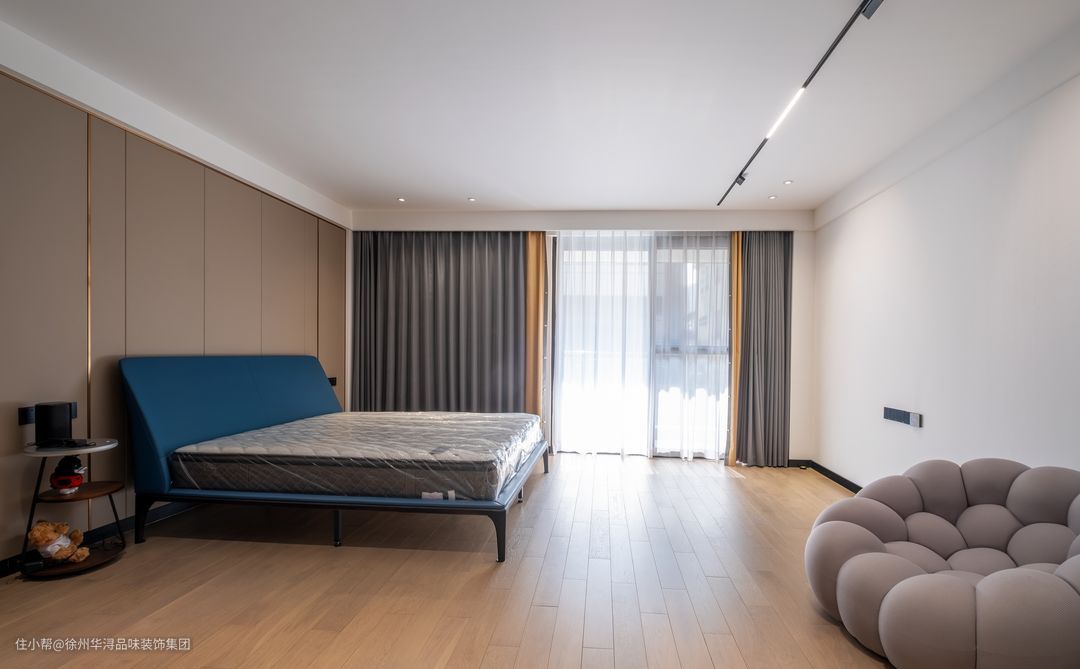 次卧以浅灰色木板,融入金色边框条塑造高级感,蓝色的床头柜与灰色的窗帘以及沙发相互辉映,打造和谐统一的风格,生活因整体风格而满足,让日常休息娱乐更惬意十足!